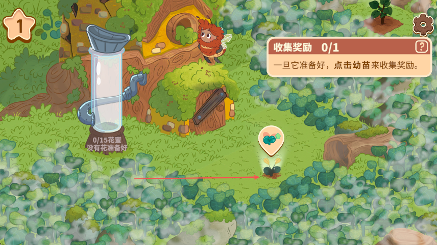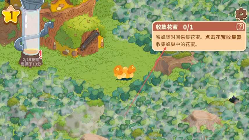 4、看到提示收集花蜜0/1,点击花蜜收集器,收集蜜蜂采集到蜂巢中的花蜜,推进游戏进程。