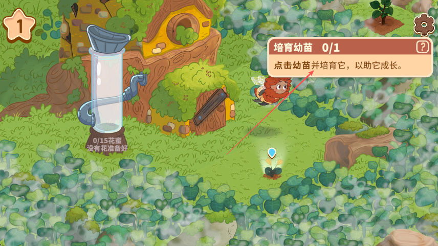 1、进入蜜蜂园林游戏,查看提示培育幼苗0/1,点击场地中的幼苗进行培育。