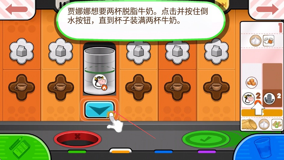 2、依照提示点击并按住倒水按钮,直到杯子装满两杯牛奶,按住倒水按钮完成牛奶装杯。