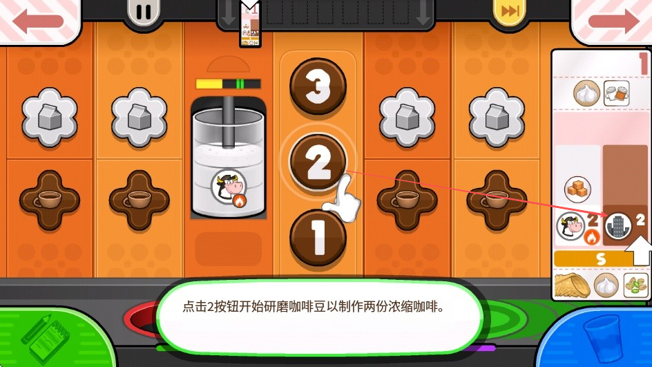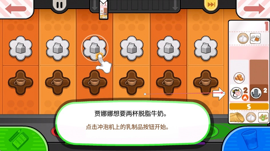 1、看到提示贾娜娜想要两杯脱脂牛奶,点击冲泡机上的乳制品按钮开始,点击对应的乳制品按钮。
