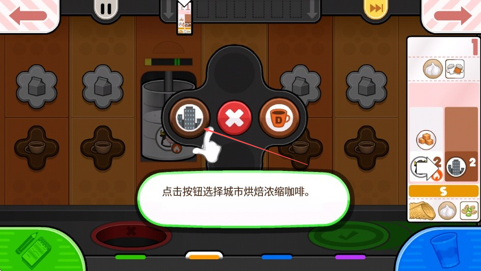 3、当出现点击按钮选择城市烘焙浓缩咖啡的提示时,点击相应按钮选择咖啡种类。