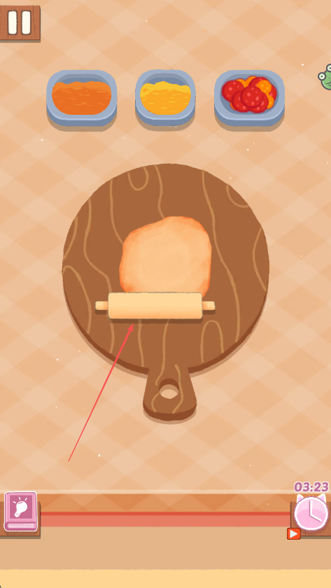 2、进入制作界面,使用擀面杖将面团擀开,铺满整个披萨盘。