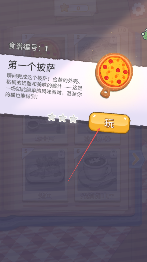 1、在食谱界面选择想要制作的菜品,如点击第一个披萨旁的玩按钮。