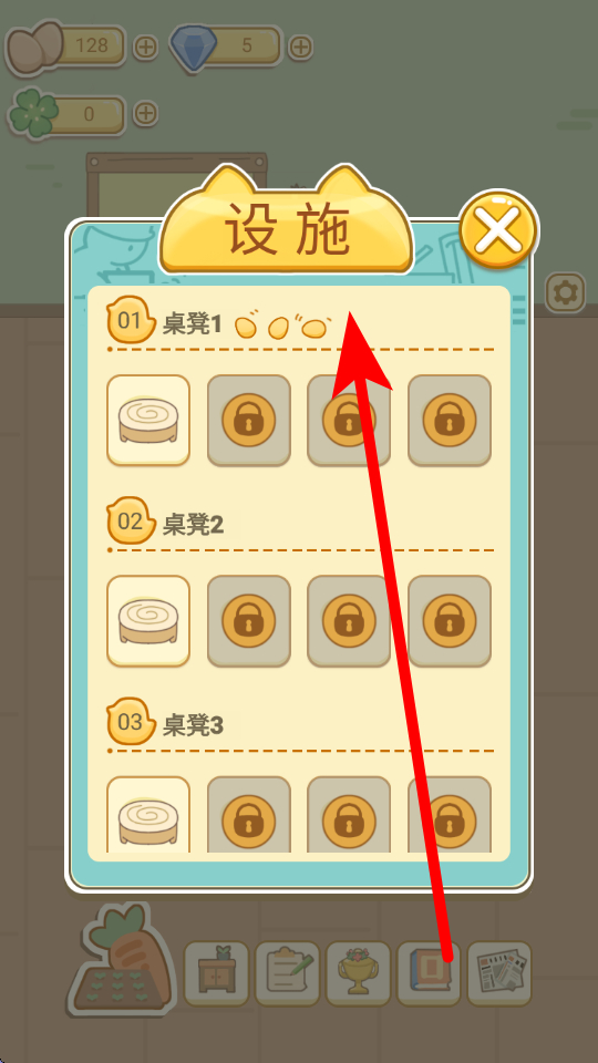 3、设施解锁环节,存在不同编号的桌凳设施,部分处于锁定状态,需积累足够资源或达成特定经营条件,解锁后能提升店铺接待能力,为后续经营拓展基础。