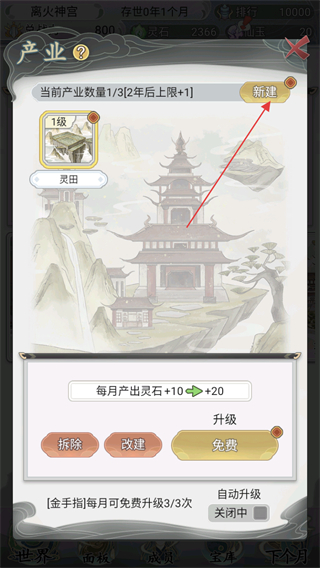 3、在宗门产业界面可以对当前产业进行升级提高灵石产出量,点击右上角新建按钮可以增加产业。