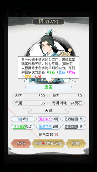 2、宗门初始是没有弟子的,所以我们需要进行招收,点击重置属性和天赋可以刷新弟子的天赋属性再进行招收。