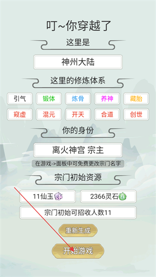 1、进入游戏开局我们需要生成一个在修仙大陆上的身份,可以重复生成,完成选项后点击开始游戏进入大陆。
