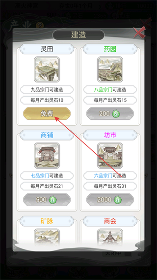 4、在建造选项页面,新手玩家可以免费建造2座灵田,点击选择即可成功建造。