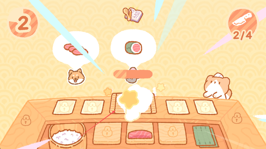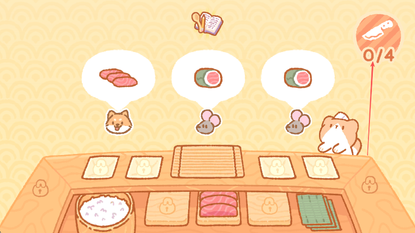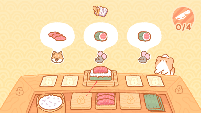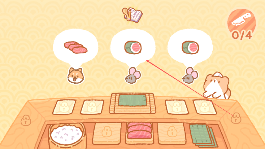 1、观察界面上方小动物气泡中的寿司样式明确订单需求,留意0/4订单完成进度。