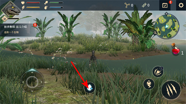 2、拖动左下角摇杆可控制恐龙移动,移动时需留意场景中的地形和资源分布,规划移动路线以高效探索或躲避危险。