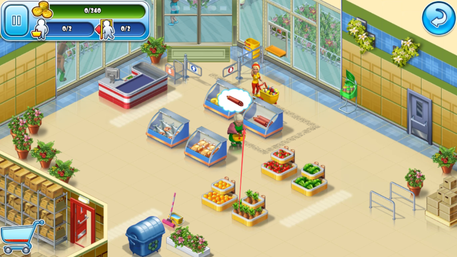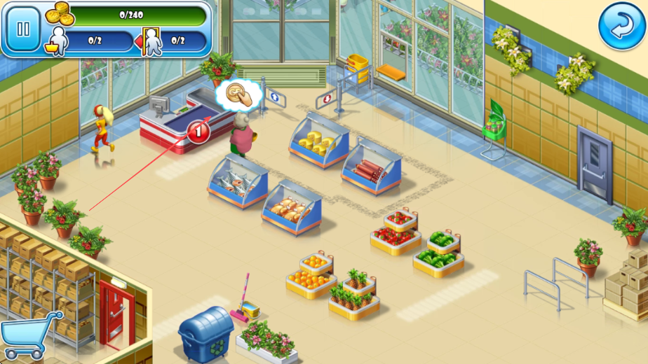 2、进入超市,看到顾客头上的物品需求气泡,如香肠,点击对应货架为顾客提供商品。