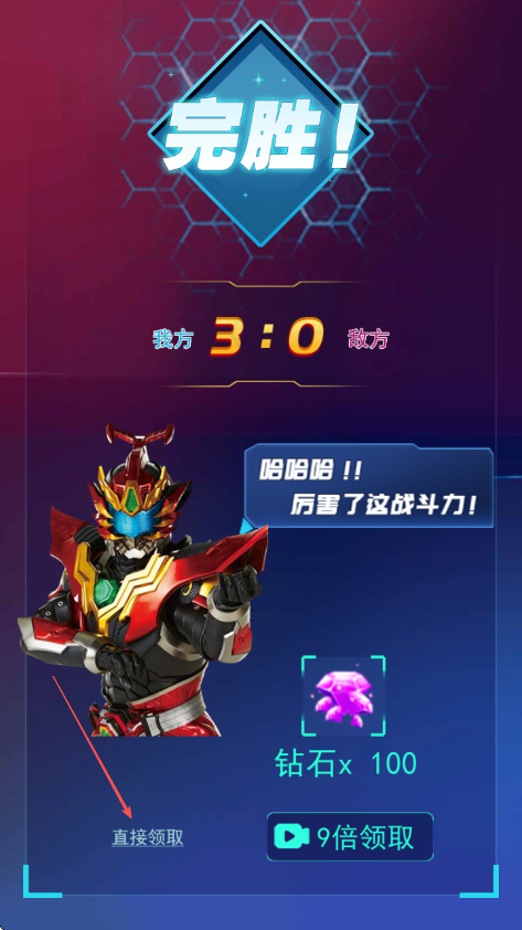 4、战斗结束显示完胜后,选择直接领取或9倍领取按钮,获取钻石等战斗奖励。