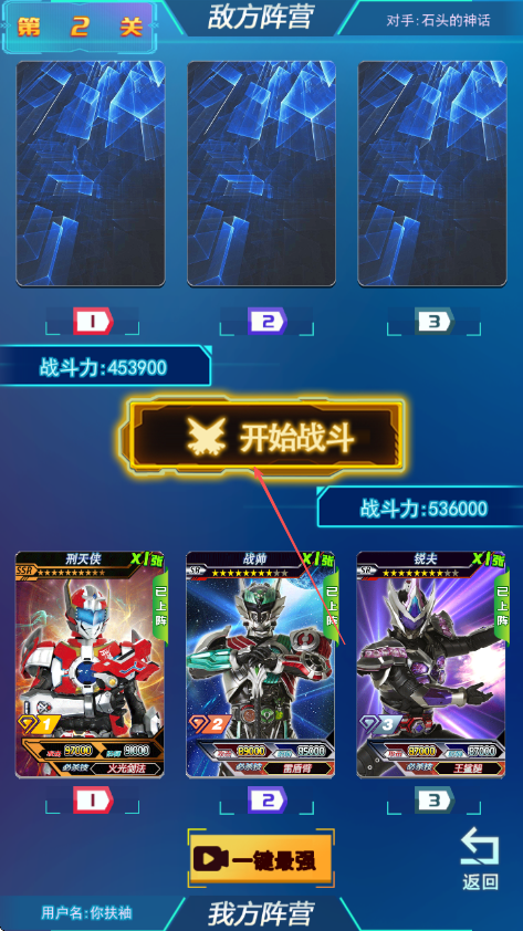 1、进入关卡界面,查看敌方阵营信息,确认对手,再观察我方阵营铠甲勇士卡牌,了解战斗力数值。