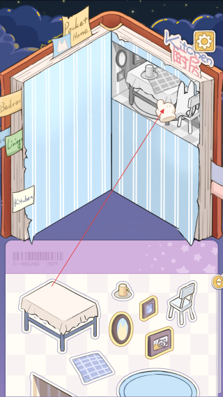 3、持续利用物品栏资源,填充房间细节,若有遗漏,会有箭头提示,营造温馨居住氛围。