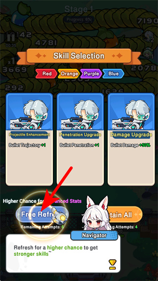 1、在技能选择界面点击Free Ref按钮,可刷新当前技能列表,提升获取技能的概率,会同步显示。
