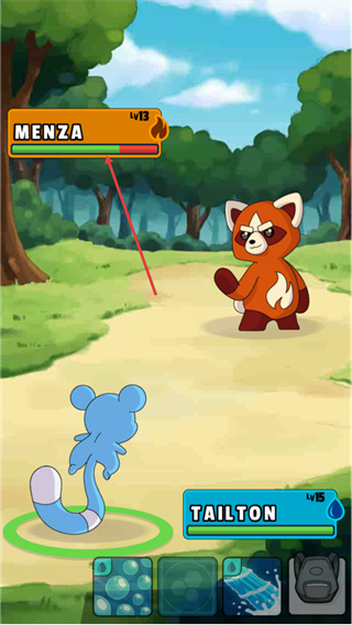 3、进入口袋妖怪对战界面后,观察底部的技能选项,点击对应的技能按钮释放技能,对敌方MENZA发起攻击。