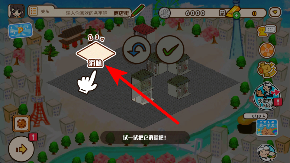 2、在建设界面,可对现有建筑进行消除操作,清理出合适空间,为后续建设新店铺或设施做准备。