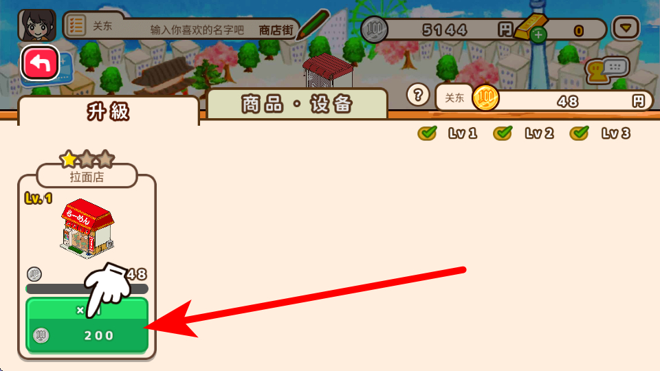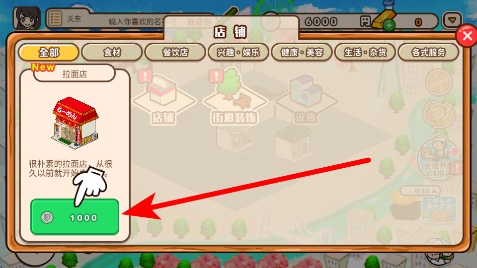 3、商店街有多种店铺可供选择,比如拉面店,花费相应货币就能建造,丰富商店街的业态。