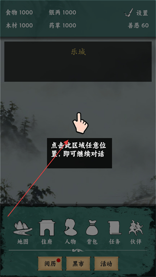 2、进入乐城界面后,根据游戏给出的提示信息,点击对应区域推进剧情,同时可查看底部功能按钮的作用。