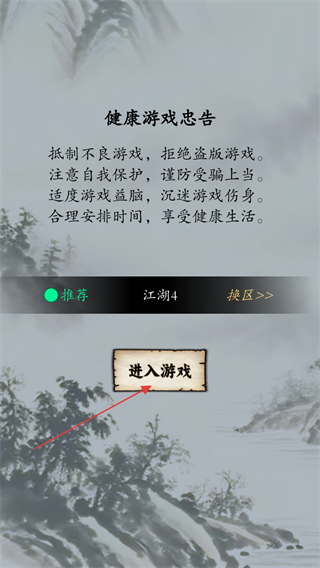 1、阅读界面的健康游戏忠告内容后,确认当前选区为江湖4,点击界面中的进入游戏按钮,即可进入游戏主场景。