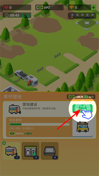 2、游戏中点击房车旁的互动区域,可触发与房车的交互操作,解锁对应的营地资源如获得690金币。