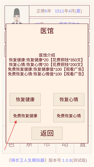 4、随着月份的增长,角色的健康值也会有所变化,点击医馆可以恢复健康值和心情度。