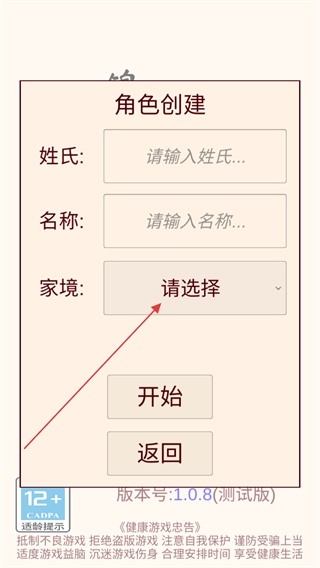 2、首先需要进行角色的创建,输入姓氏名称和家境的选择,点击下方开始进入剧情。