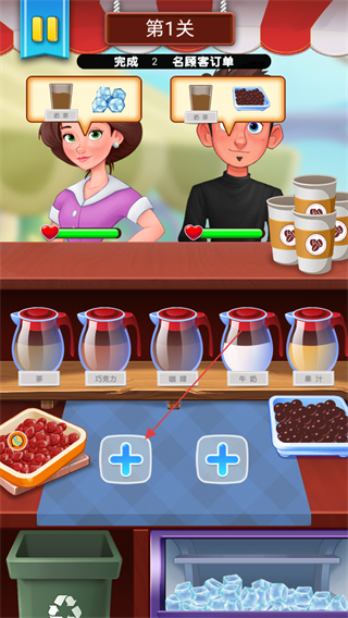 2、在第1关中,需完成2名顾客的订单,点击桌面上的加号按键,添加杯子放置在桌面上,再继续执行后续操作。