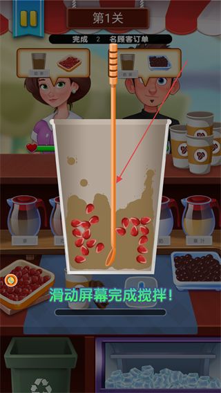 4、在第1关的制作环节,原料加入容器后,按照提示滑动屏幕完成搅拌操作,即可完成该饮品的制作流程。