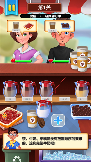 3、关卡内茶、牛奶、小料无放置顺序要求,按提示先倒牛奶,再添加对应配料以完成顾客的订单。