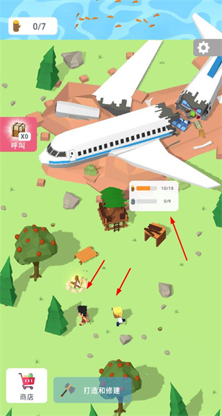 2、在飞机残骸等场景中收集木材、石头等资源,同时利用场景中的树木、苹果等获取物资,为建筑打造和升级提供资源支持。