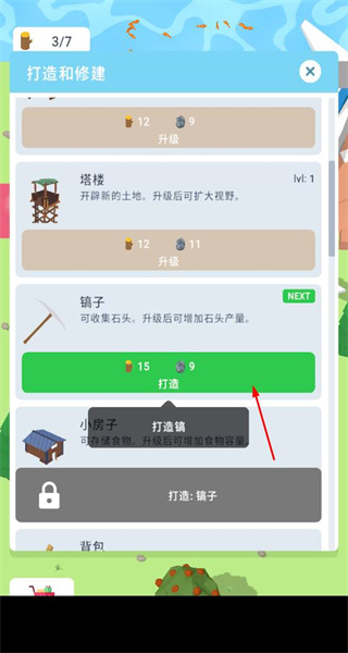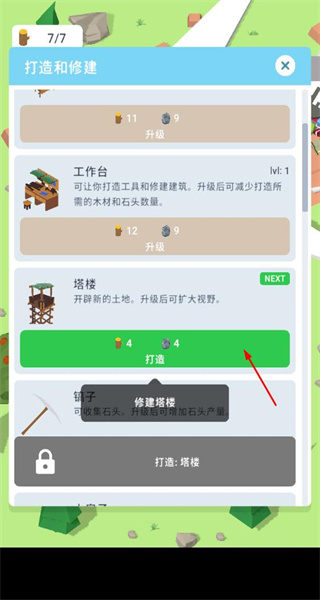 1、在打造界面消耗木材、石头等资源,打造并升级工作台、塔楼、镐子等建筑设施,减少打造资源消耗、扩大视野或增加资源产量。
