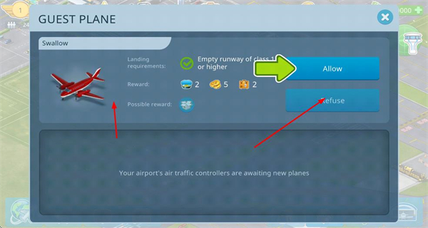2、面对guest plane请求,根据机场跑道条件选择Allow允许降落,或Refuse拒绝,获取对应奖励。