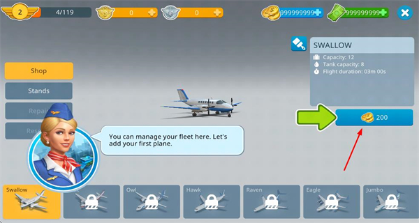 4、进入机队管理界面,消耗资源解锁并添加新飞机,扩充机队规模以承接更多航班任务。