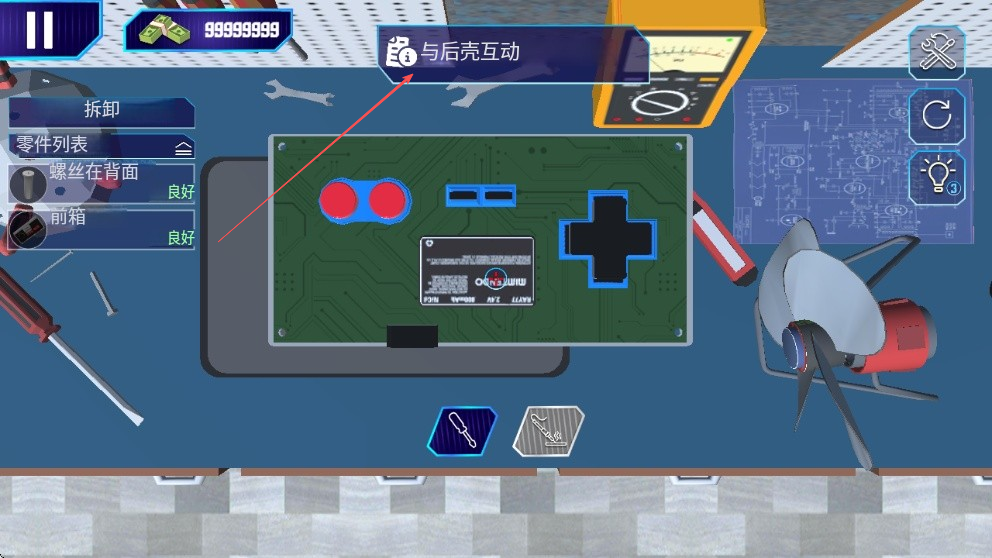 4、根据提示与后壳等部件互动,检查内部电路板等组件,维修或更换损坏零件,完成修理任务。