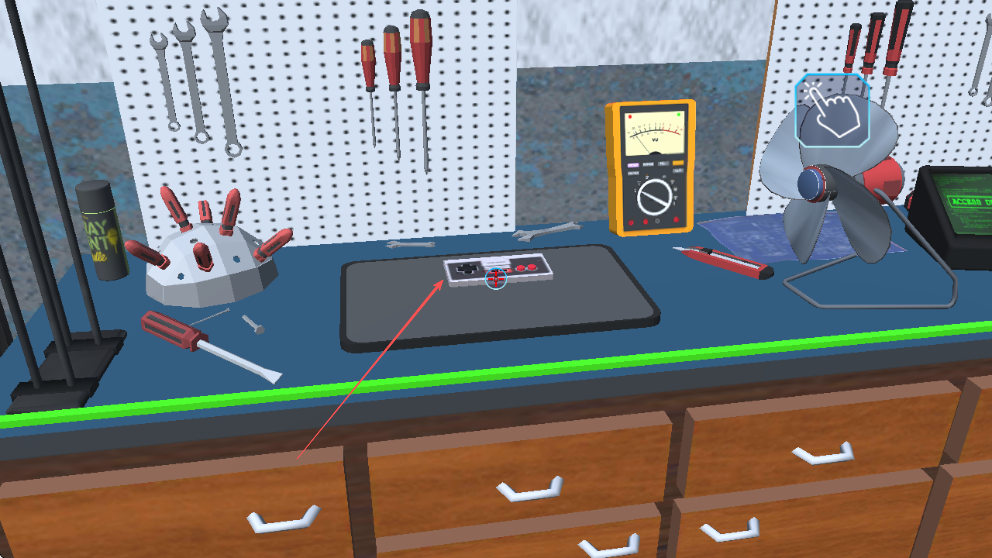 1、进入游戏,在工作台找到待修理的游戏手柄,点击进行修理操作。