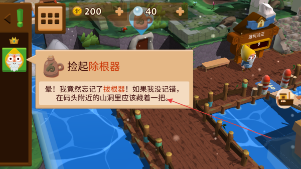 1、进入游戏界面,阅读提示信息,得知要在码头附近山洞找除根器。