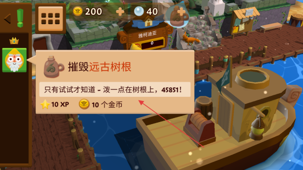 4、按照提示,使用除根器摧毁远古树根,获取经验值和金币。
