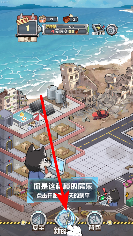 1、新的一天开始,进入游戏后,点击相关按钮,即可开启新的游戏,开启当天的生存经营之旅,为后续的收留幸存者等操作做好准备。