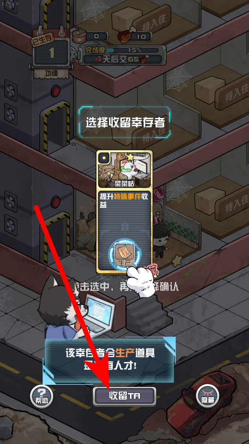 2、收留幸存者,在过程中,会出现可收留的幸存者选项,点击收留TA,就能将幸存者收入自己的基地,这些幸存者能为基地发展提供助力。