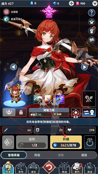 2、在英雄信息界面中,可以点击升级按钮,消耗经验石进行升级。