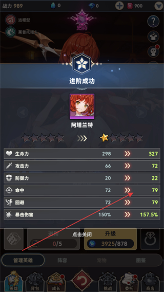 3、获得到三张进阶卡牌后,可以对英雄进行进阶提升,进阶成功后可以看到英雄的属性将会大幅度提高。