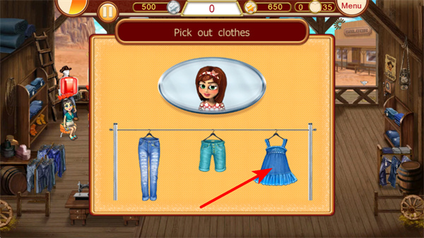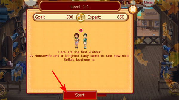 1、游戏中点击Start按钮,可进入服饰店经营关卡,这是开启游戏操作,点击后将开始接待顾客的经营之旅。