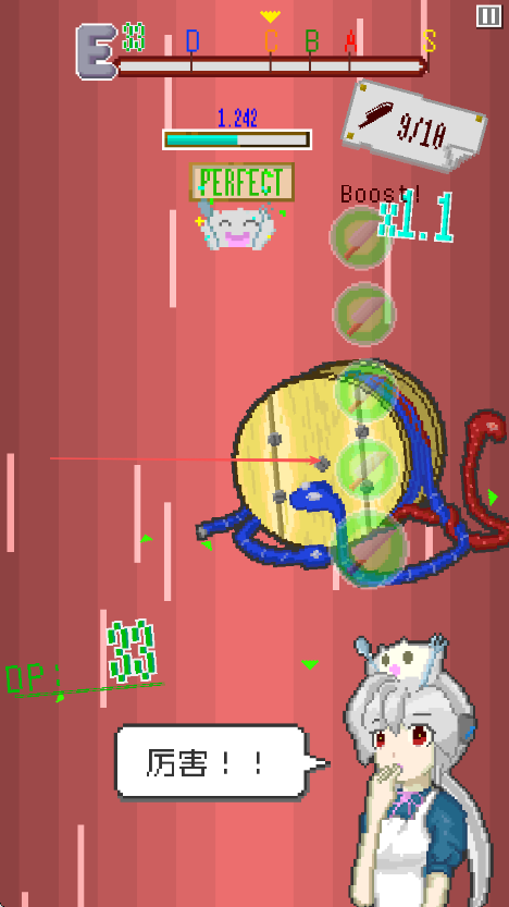 3、留意屏幕上方的评分等级条E到S,连续精准点击提升Boost倍数,获取更高分数。