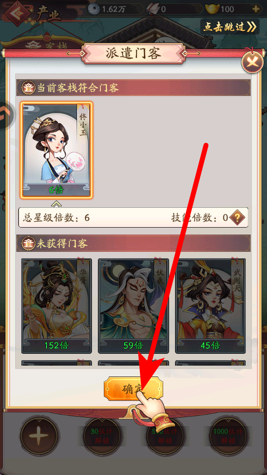 4、产业经营过程中,可派遣门客,选择符合条件的门客,点击确定按钮派遣,门客能助力产业更好地发展,提升收益效率等。