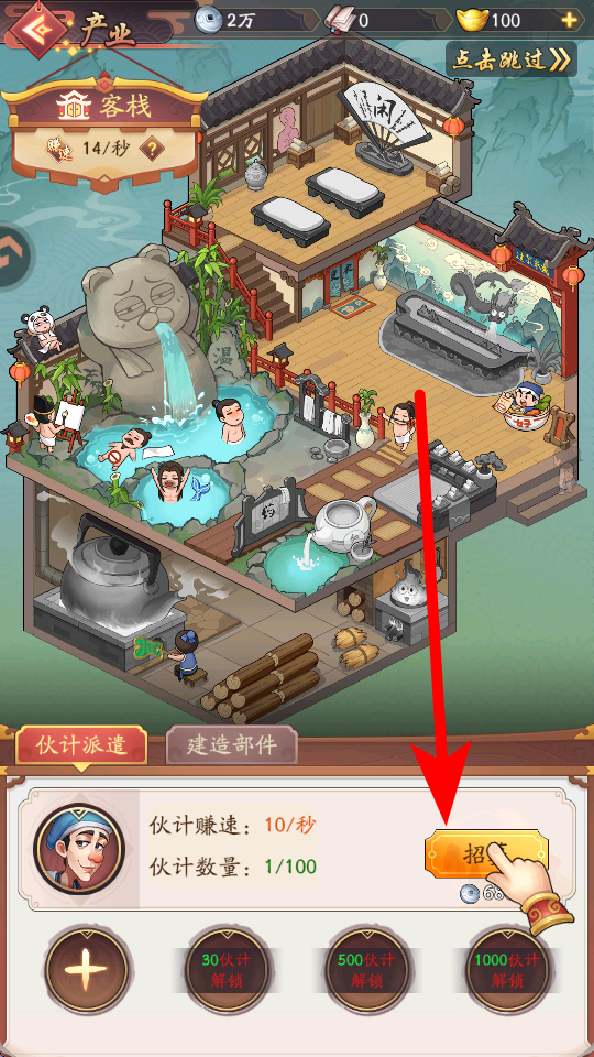 3、产业解锁后,可进行伙计招募,点击招募按钮,消耗相应资源就能增加伙计数量,伙计数量越多,产业赚钱的速度也会越快。