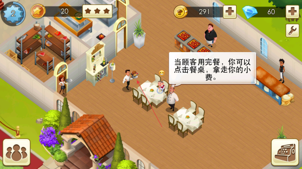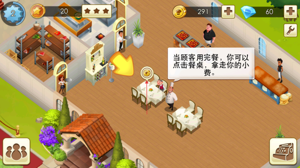 4、顾客用餐结束,点击餐桌收取小费,赚取金币升级餐厅。