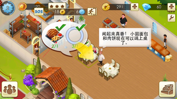 2、看到菜品提示,如小圆面包和肉饼现在可以端上桌了,点击厨师让其准备菜品。