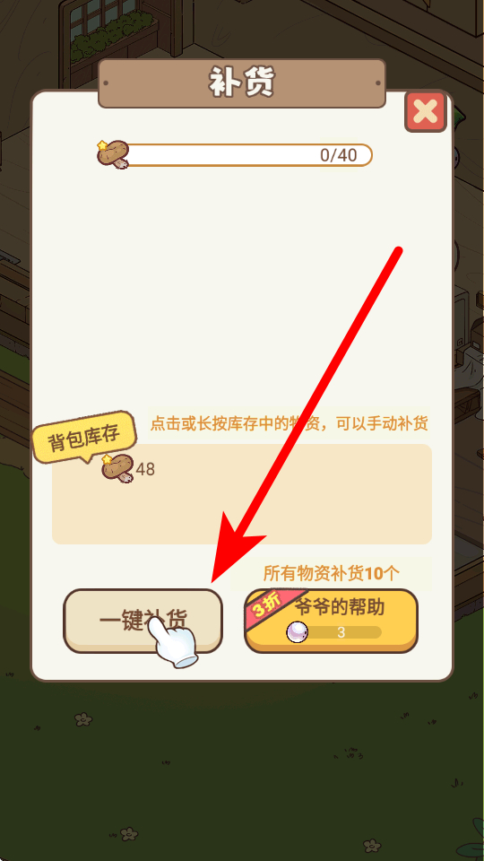2、备货环节,可查看背包库存,若有足够食材,能点击一键补货,快速补充餐厅所需物资,方便后续为顾客提供餐品。