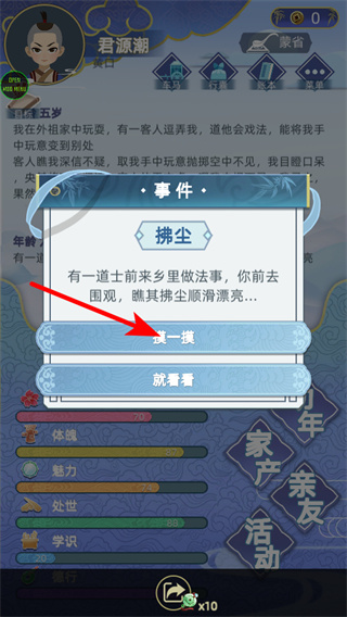 2、面对拂尘事件时点击摸一摸,互动选择是探索奇遇的核心步骤,选择后可与道士的拂尘产生互动,获得特殊机缘属性提升。